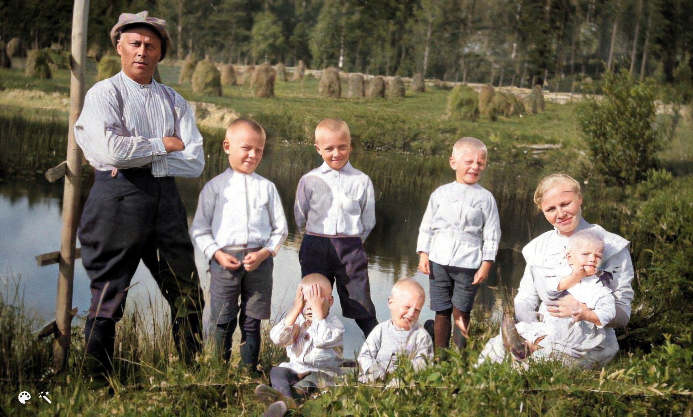 Mies, vaimo ja 6 lasta pienintä myöten heinäpellolla 1920-luvulla. Pielisen museo – väritetty In Colorilla.