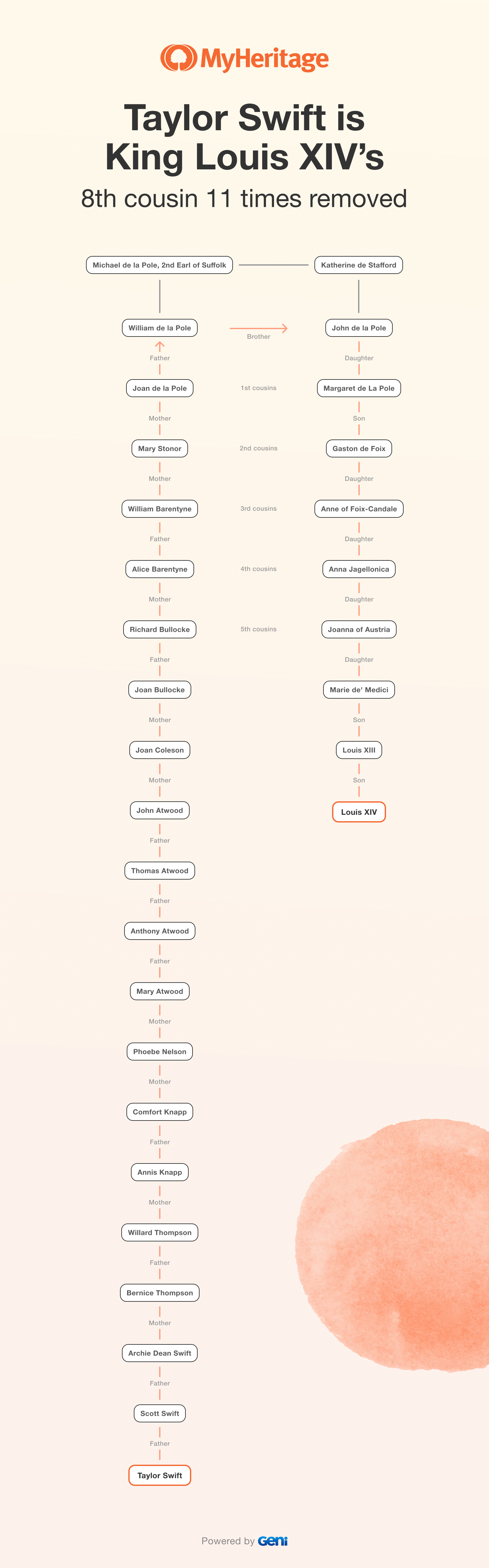 Kun ’popin kuningatar’ Taylor Swift viime vuonna Eras Tour -kiertueensa yhteydessä valmistautui hurmaamaan Pariisin, tutkijatiimimme Ranskassa perehtyi hänen sukujuuriinsa ja löysi kiinnostavan yhteyden: Taylorin kaukainen sukulainen on Ranskan kuningas Ludvig XIV!