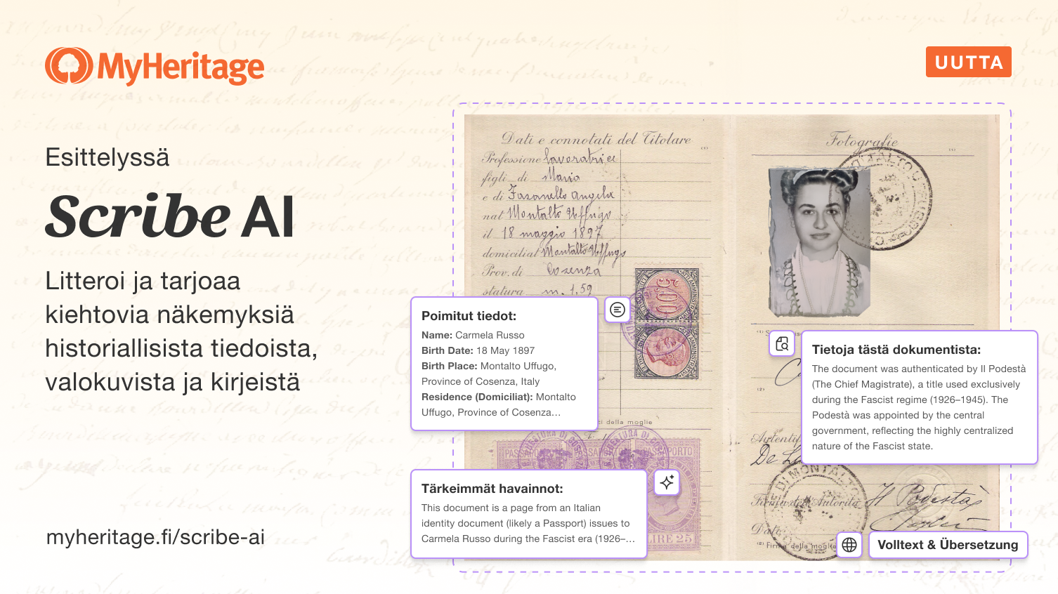 Esittelyssä Scribe AI: Litteroi, tulkitse ja saa oivalluksia historiallisista asiakirjoista ja valokuvista sekä MyHeritagen historiallisista tiedoista